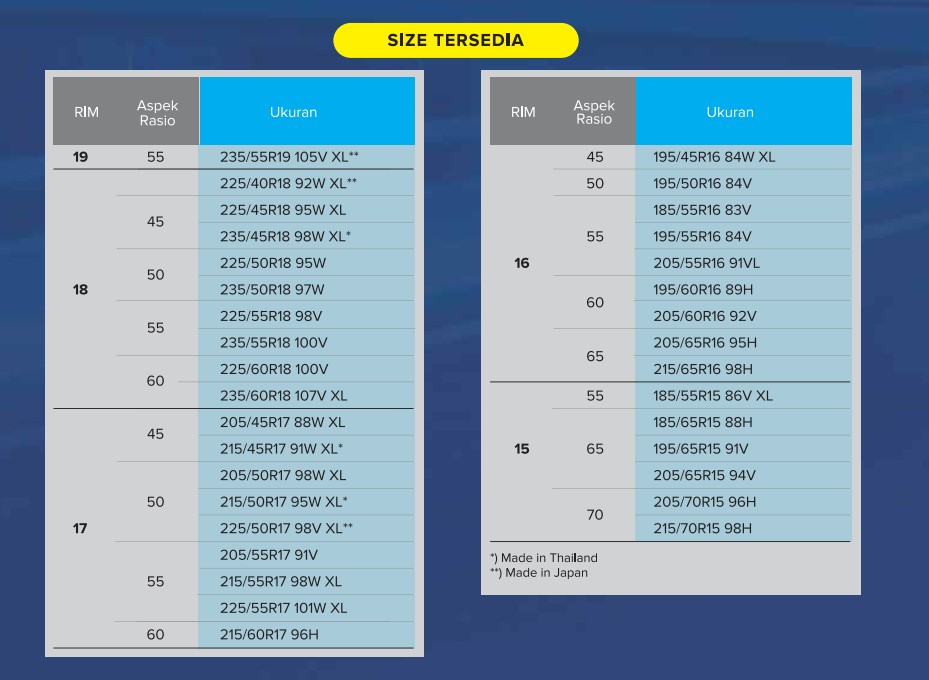 Blue Response TG hadir dalam pilihan ukuran yang lebih lengkap mulai dari rim 15- rim 19, tersedia dalam total 34 ukuran.