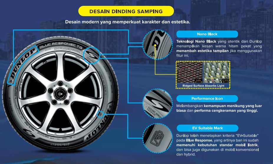 Dunlop merancang Blue Response TG dengan konsep EV Ready, yang menandakan bahwa ban ini mampu mengakomodasi karakteristik khusus kendaraan listrik, seperti bobot kendaraan yang lebih berat, torsi instan, serta kebutuhan efisiensi dan tingkat kebisingan yang rendah. Blue Response TG cocok digunakan untuk berbagai jenis kendaraan, mulai dari mobil konvensional, hybrid, hingga kendaraan listrik (EV).